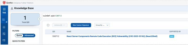 | WebApp/AppSec QID | 530712 | React Server Components Remote Code Execution (RCE) Vulnerability (CVE-2025-55182) (React2Shell) |