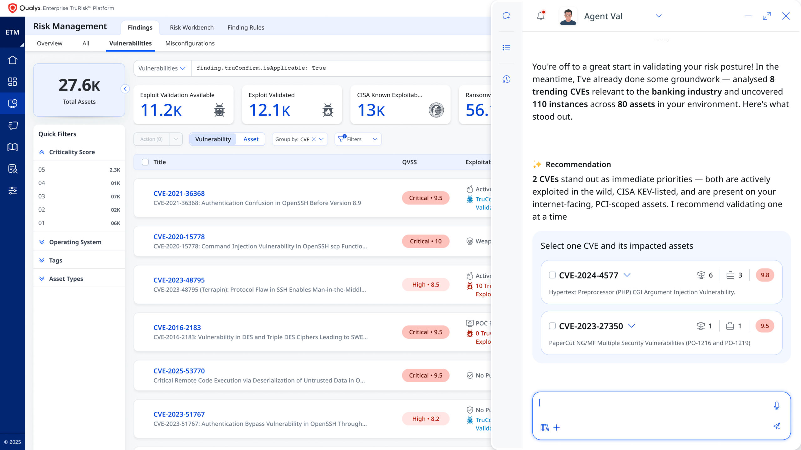The hardest problem is not finding vulnerabilities. It is selecting the right handful that matters now. Agent Val acts as a risk-aware selection engine on top of ETM. It considers TruRisk scores across Qualys and third-party sources, TruLens threat context, asset exposure profiles, CISA KEV alignment, and exploit availability. From tens of thousands of CVEs and thousands of KEV entries, it narrows the focus to a small set of exposures that are both weaponized globally and relevant to your highest-value assets. The result is often fewer than 10 exposures, specific findings that are both weaponized globally and relevant to the customer’s highest-value assets. Validation is treated as a decisioning problem, not a bulk scan.