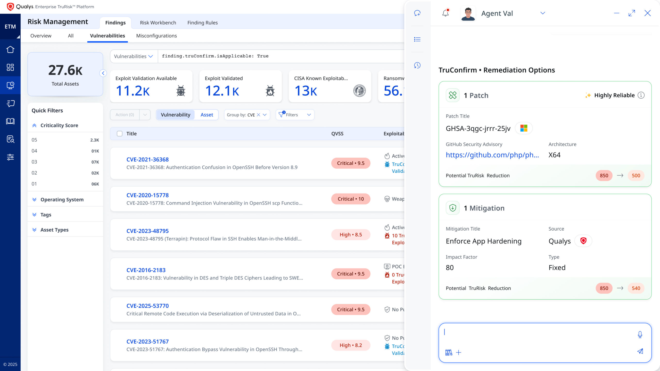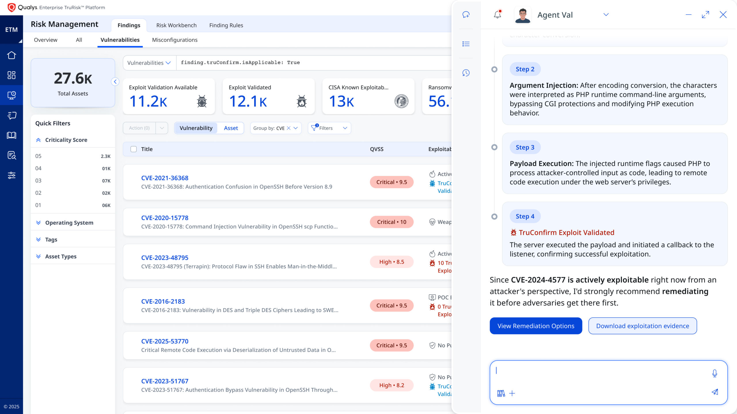 The primary challenge in vulnerability management is proving what is actually exploitable. Many vulnerabilities are not exploited, but still drain resources. Traditional tools often fail to validate real risks. Agent Val, within Qualys Enterprise TruRisk Management, delivers this through a closed-loop workflow of validate, mitigate, and revalidate, shifting security operations from theoretical risk management to proven risk reduction at machine speed.