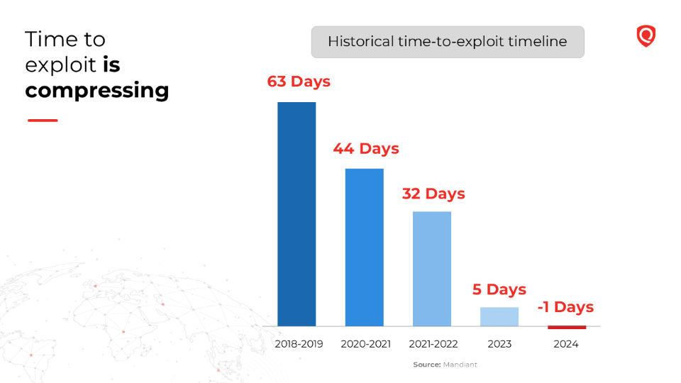 In 2018, the average time between vulnerability publication and first exploitation in the wild was 63 days. By 2021, it was 32 days. By 2023, five days. Mandiant’s 2024 data showed an average of -1 day, meaning exploitation now routinely occurs before the patch even exists. This is a structural mismatch between human-speed defense and machine-speed offense. More analysts and faster ticket queues cannot reverse it.