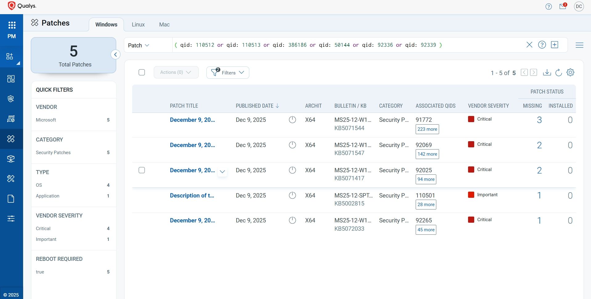 VMDR rapidly remediates Windows hosts by deploying the most relevant and applicable per-technology version patches. You can simply select respective QIDs in the Patch Catalog and filter on the “Missing” patches to identify and deploy the applicable, available patches with one click.