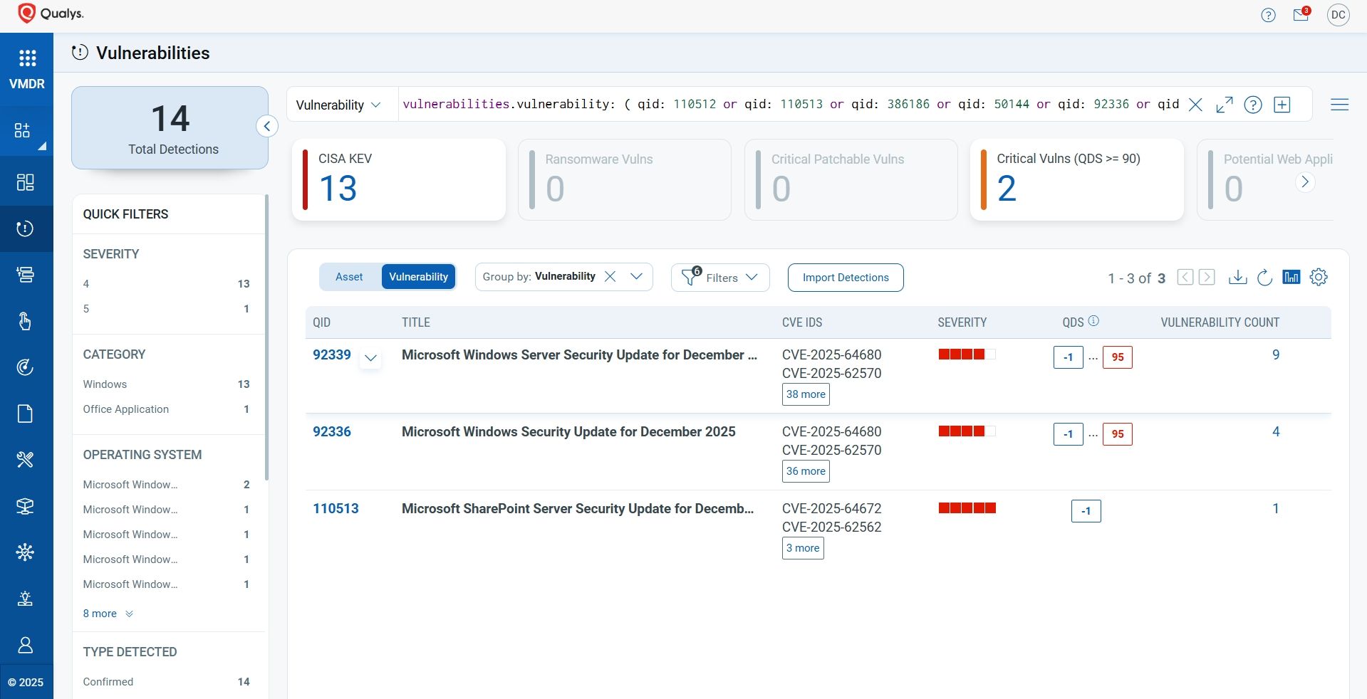 Qualys VMDR automatically detects new Patch Tuesday vulnerabilities using continuous updates to its Knowledgebase (KB).